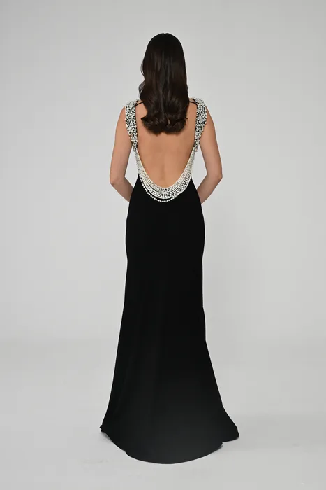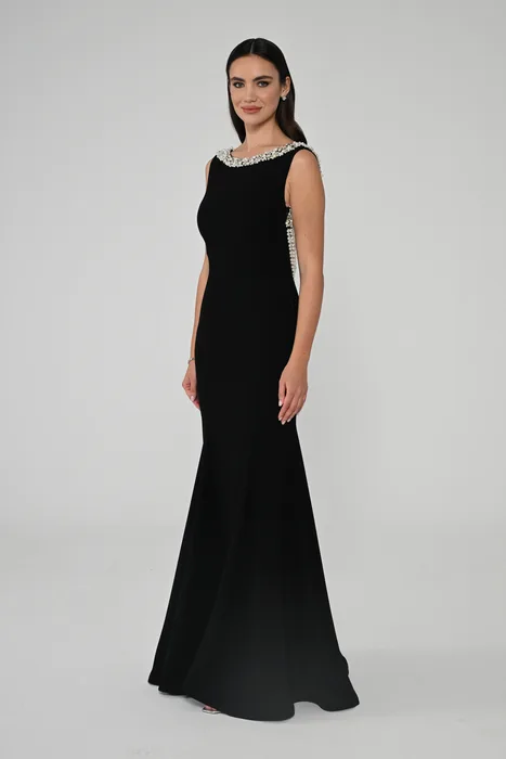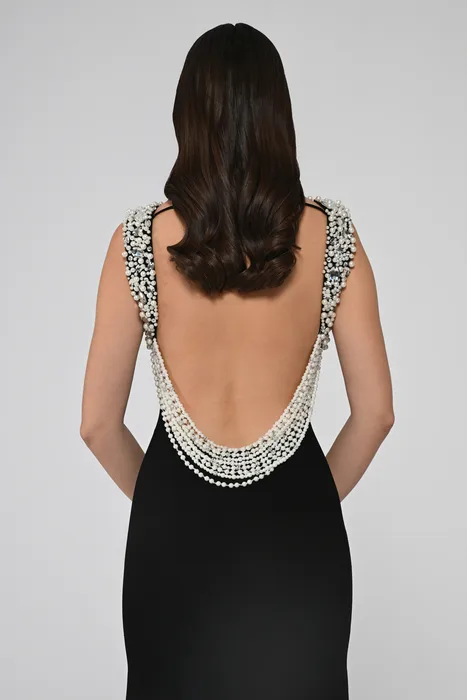 RA6756 - שמלת מקסי מבד קרפ עם עיטורי פנינים בצווארון ובגב