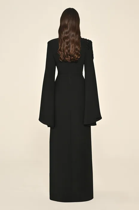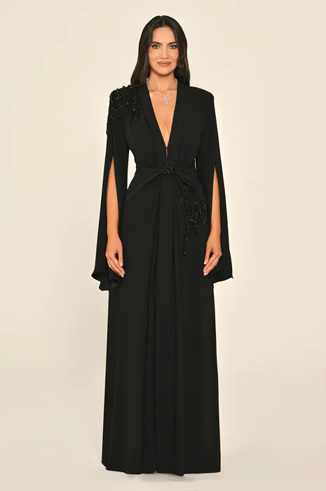 RA7286 - שמלת מקסי מבד קרפ עם מחשוף V, כריות כתפיים, שרוולי צעיף, חרוזים וכיווצים (Draped) בחזית