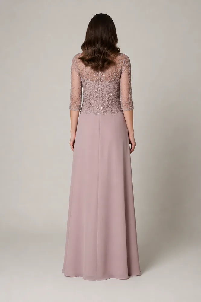 RAM312 - שמלה עם מחוך מרשת משובצת חרוזים ושרוולים שקופים המשתלבים בצורה חלקה בחצאית שיפון עגולה