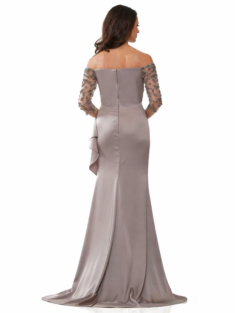 RAMV1254 - שמלת פייל אלסטית עם מחשוף כתפיים חשוף, שרוולים שקופים משובצים חרוזים, וחצאית נשפכת בעדינות הנמשכת לזנב רכבת אלגנטי