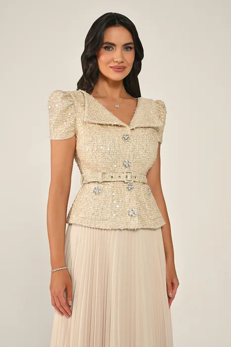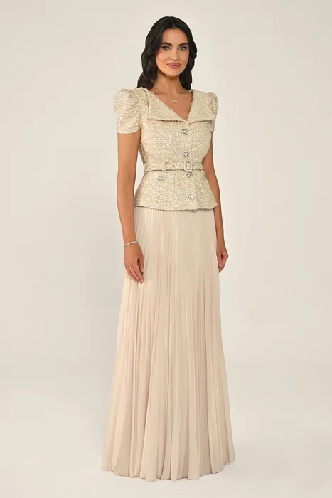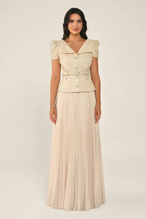 RA7361 - שמלת מקסי המורכבת מז'קט טוויד עם פאייטים וחצאית שיפון עם כפתורי אבנים