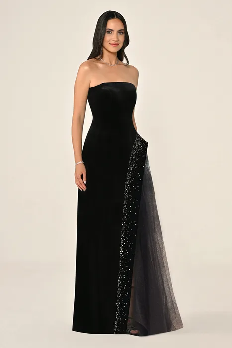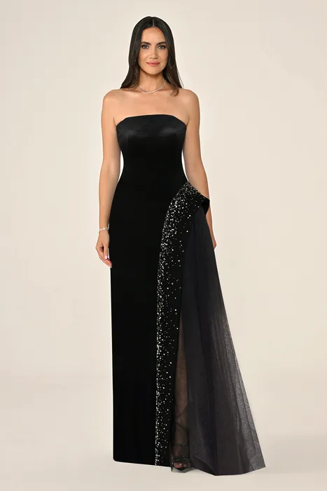 RA7235 - שמלת מקסי מבד קטיפה בגזרת סטרפלס עם חצאית טול מעוטרת אבנים