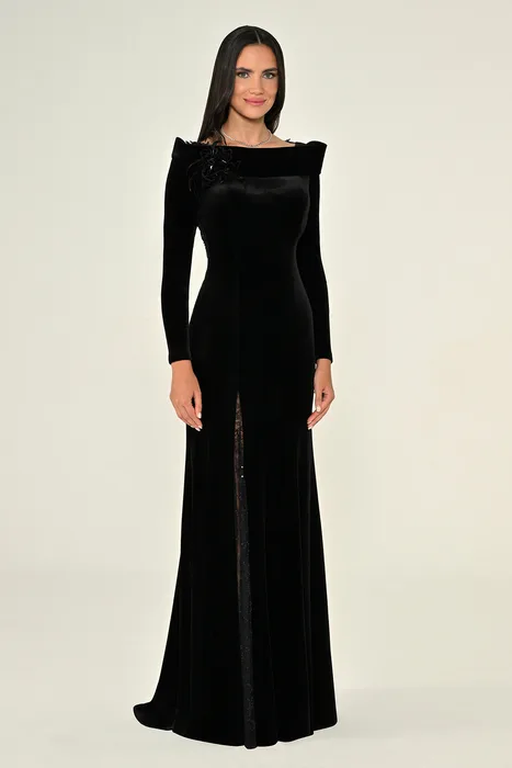 RA7186 - שמלת מקסי מבד קטיפה עם שרוולים ארוכים, גב תחרה ושסע