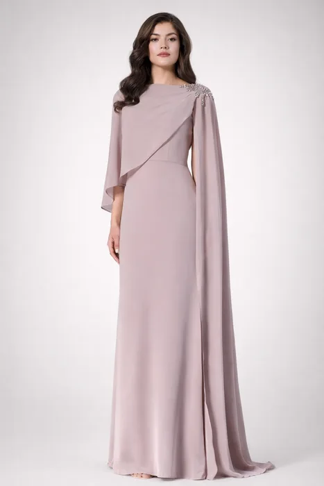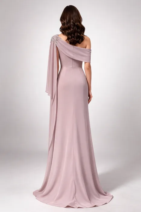 RAMV1362 - שמלה א-סימטרית עם בד נשפך, בעיטור תכשיט בכתף ושכבת קייפ זורמת מעל