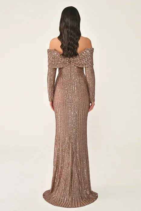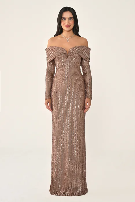 RA7387 - שמלת מקסי עם פאייטים, שרוולים ארוכים ומחשוף כתפיים (Off-Shoulder)