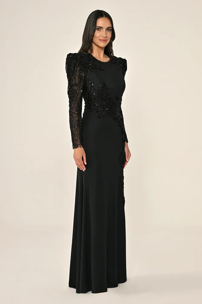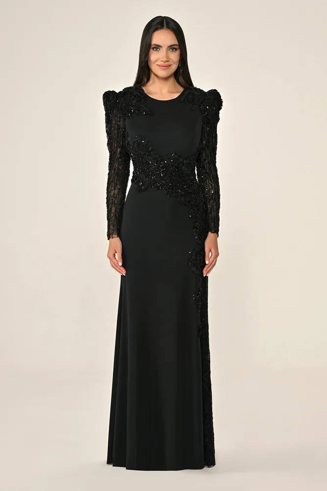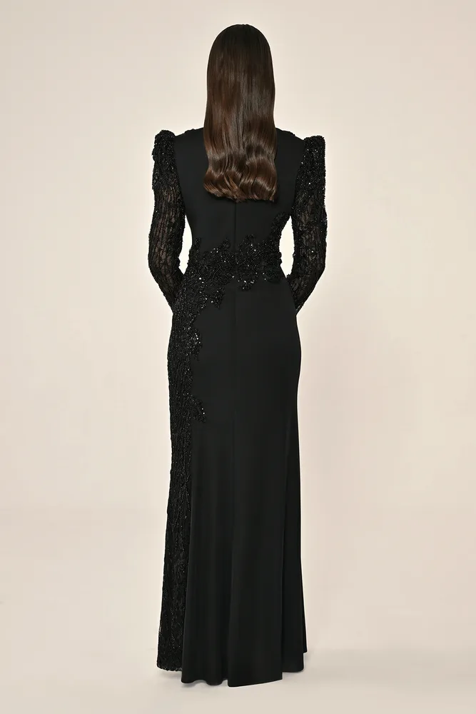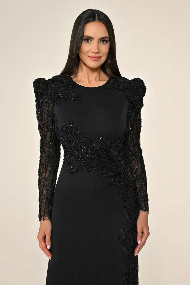 RA6950 - שמלה ארוכה עם פאייטים בשרוולים, במותן ובשסע