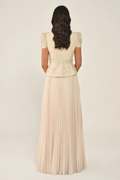 RA7361 - שמלת מקסי המורכבת מז'קט טוויד עם פאייטים וחצאית שיפון עם כפתורי אבנים