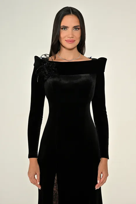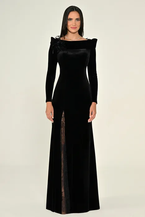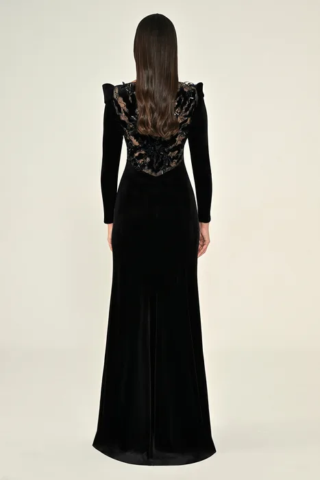 RA7186 - שמלת מקסי מבד קטיפה עם שרוולים ארוכים, גב תחרה ושסע
