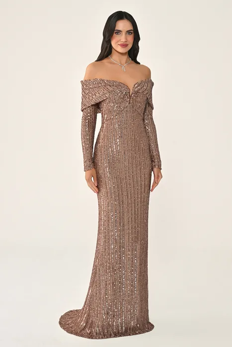 RA7387 - שמלת מקסי עם פאייטים, שרוולים ארוכים ומחשוף כתפיים (Off-Shoulder)